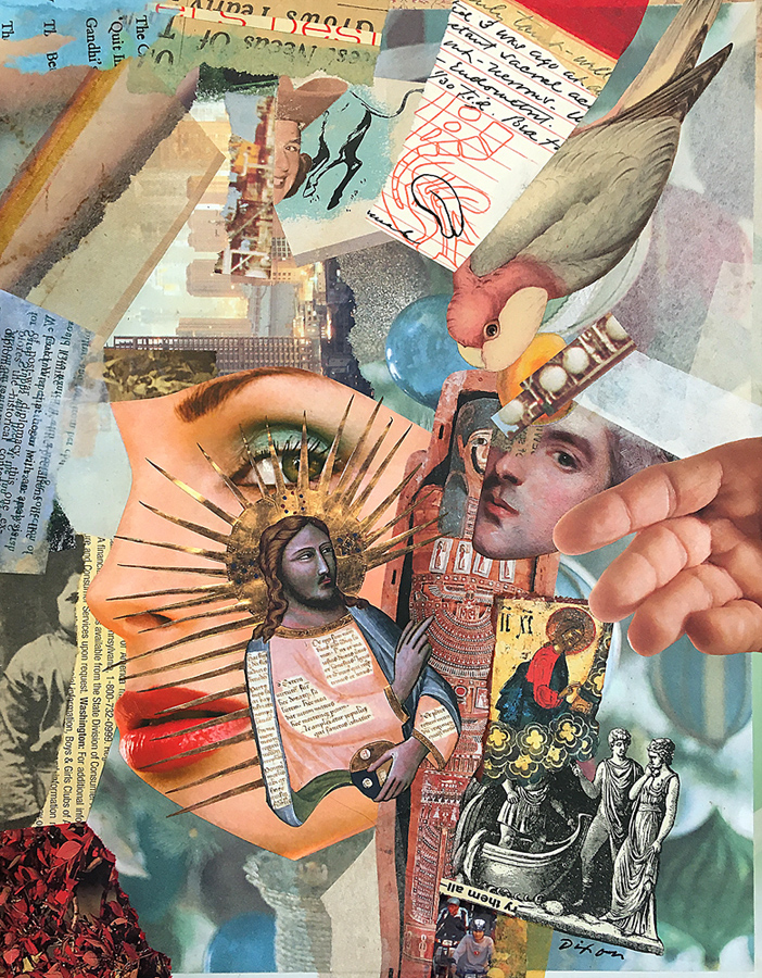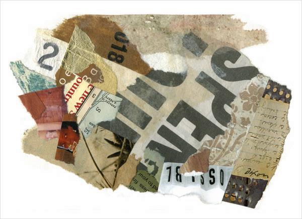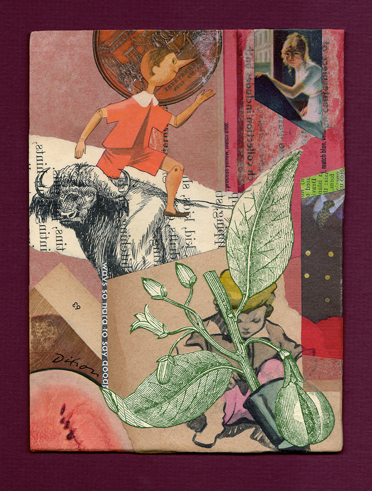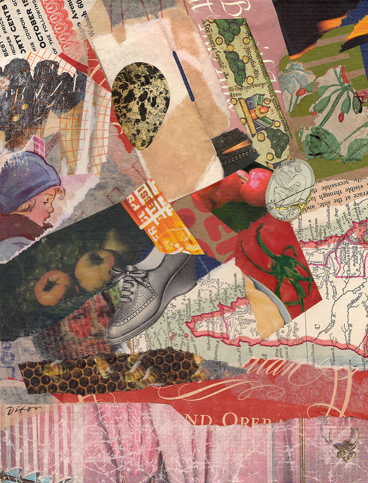 Collage is always about the ingredients. They will provide the stimulus, the catalyst, the “muse,” if you will, that leads to an unexpected next step. They can provide a clue to follow, the suggestion of continuity, and sometimes one piece of paper is the puzzle solution that you never saw coming. Respond to ingredients intuitively, and learn to recognize a spontaneity that isn’t driven by thoughts or feelings. What seems right for the context? It is a sense that an element does or does not “belong,” whether it is a harmonious similarity or an energetic contrast.