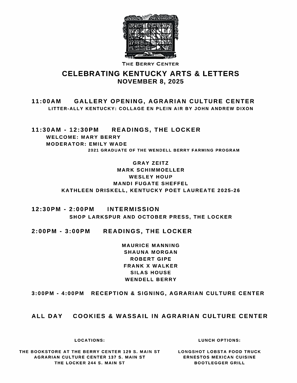 It is such a privilege to be the featured visual artist at The Berry Center’s ARTS & LETTERS celebration this Saturday. My LITTER-ally KENTUCKY landscapes will be on display through year’s end at their Agrarian Culture Center in New Castle.
