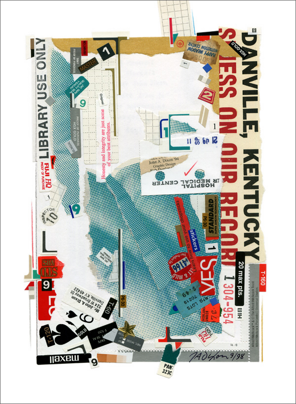 When I was 21, I had a single conversation with a man named Henry who boarded at the Cincinnati house where I lived. He seemed much older at the time, but I would guess now that he was barely 25. What I took away from that one exchange was Henry’s strong conviction that I should start a journal, as he had done several years before. Heeding his invaluable advice, I kept an active journal close at hand from that point forward. At first, it was just words, because I already had various sketchbooks as a student. Eventually, it became a comprehensive repository for personal notes, musings, doodles, and thumbnail ideas. As time passed, the content took on more of the character of visual exploration, with whole pages devoted to spontaneous collage experiments and studies for what might or might not lead to a finished artwork. I discovered that John Wllenbecher and others were calling their volumes “commonplace books,” a term more strictly applied to a “verbal scrapbook.” For some reason, mine also seemed a bit large for that particular name (sometimes 11 x 14, but most often 8.5 x 11), and so I’ve always continued to think of them as my journals. In combination with the many hundreds of handmade greeting cards I’ve created over the same period of time (nearly 40 years now), these private “chronicles” have served as the primary incubator for my work as a collage artist.
