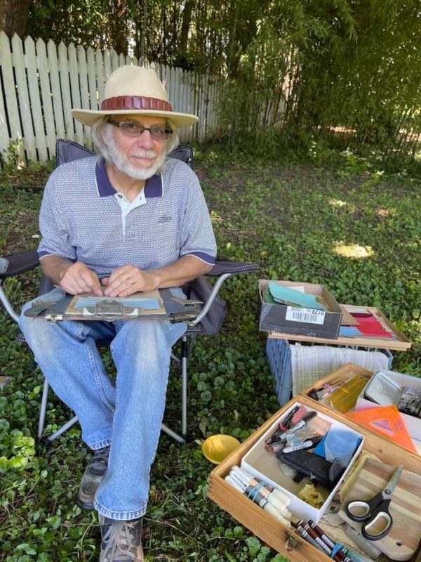 Yes, I’m happy, because I met an elusive goal that’s bugged me since my first experience with creating collage en plein air. With unfeigned satisfaction, I finished something entirely on location. This piece will probably mean more to me as a milestone than it might to anyone else. Now I feel better prepared to confront this Saturday’s “Paint the Town” landscape challenge. Unlike last summer’s more relaxed version, this event will be the real deal!