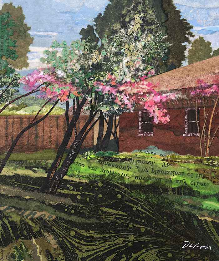 It has been too “moist” this week for me to make art with paper outside, so I did my studio finish to the collage that I had started at a previous Art Out. Whether or not it is apparent to others, I try to do something different each time, an interpretation or radical ingredient choice that causes discomfort at first. I think it’s important to momentarily frighten myself. Then I know that I might be breaking new ground.