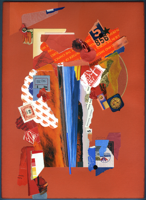 Forgive me if all of this undue rambling merely serves as an opportunity to highlight two “finished” collage artworks that I recently chose to revisit. Both examples also illustrate the complications of visually comparing two images created with different digital devices. After writing about a corresponding issue last week, I have since discovered S Caswell-Pearce’s related words from an April entry at paper with a past. My images for Rhapsody with Fever Chills demonstrate the same scanner/camera differential, although the scan of the new version is a better rendition of the artwork’s strong complementary effects. (This piece is currently on display with the “Seeing Red” exhibit in the McKinney Conference Center at Kentucky’s Constitution Square Historic Site.) The digital documentation of a revised Broken Qualifications, having shared the original version previously at this site, became a bit more challenging the second time around, given the addition of three-dimensional ingredients. At any rate, neither piece had ever felt fully resolved, although I had no specific plans to “reopen the case” until I made a broader reassessment of my inventory. Did I enhance them, ruin them, or just squander my time? You be the judge.