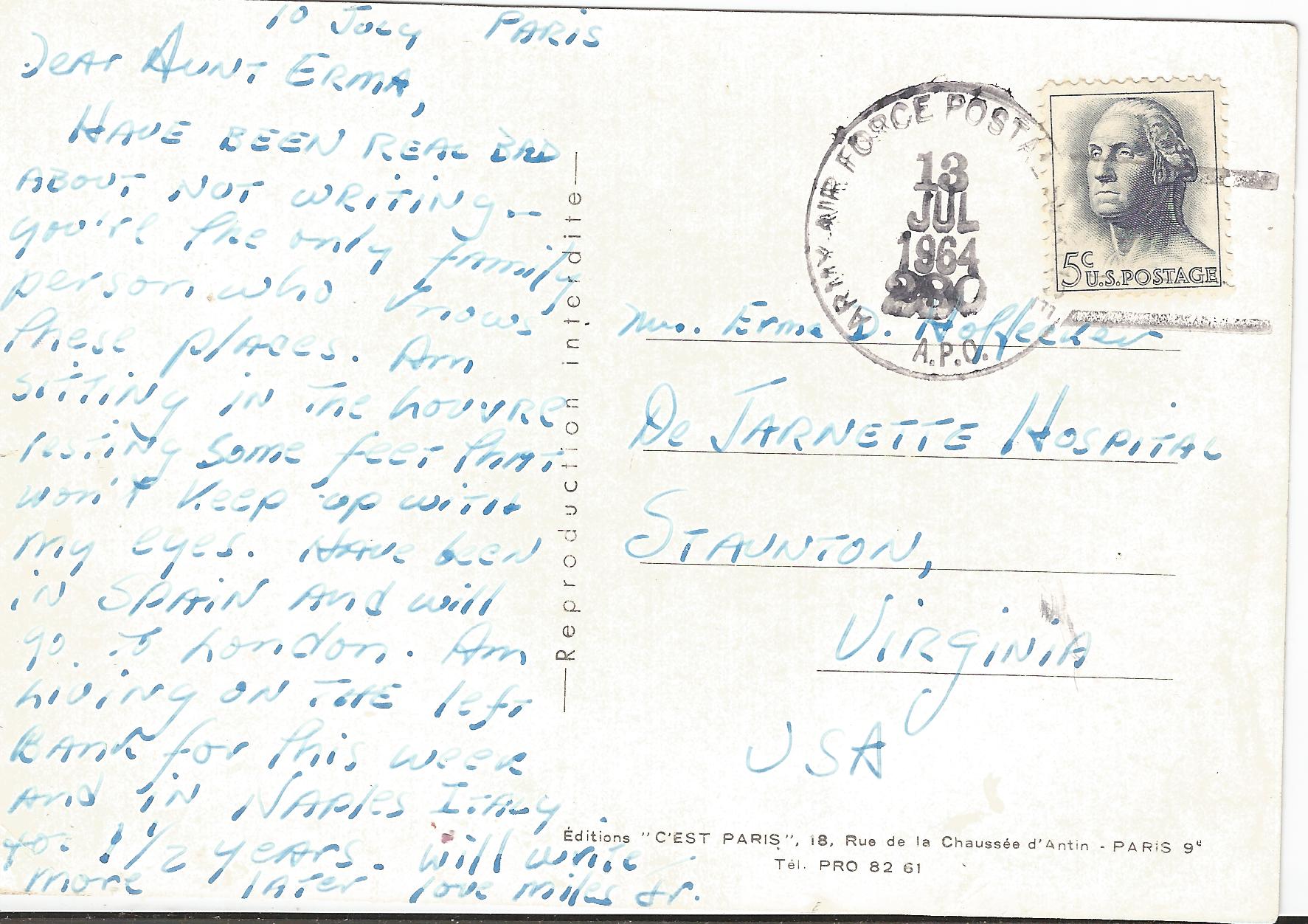 My collage on 50-year-old postcard arrived in Wales and it was posted to the ABAD site today. The reverse of the vintage card is probably more interesting than my improvisation on the image side. A message from Miles, Jr. (sitting in the Louvre, resting feet more tired than eyes) was written on July 10th and received an Army Air Force postmark on July 13th. Apparently his Aunt Erma was in the hospital — a nephew reaching out to “the only family person who knows these places.” Whether or not she ever came home is unknown, but we can only imagine that the card from Paris evoked for her more than a few memories of Europe, the bitter as well as the sweet.
