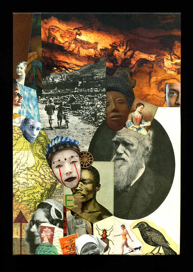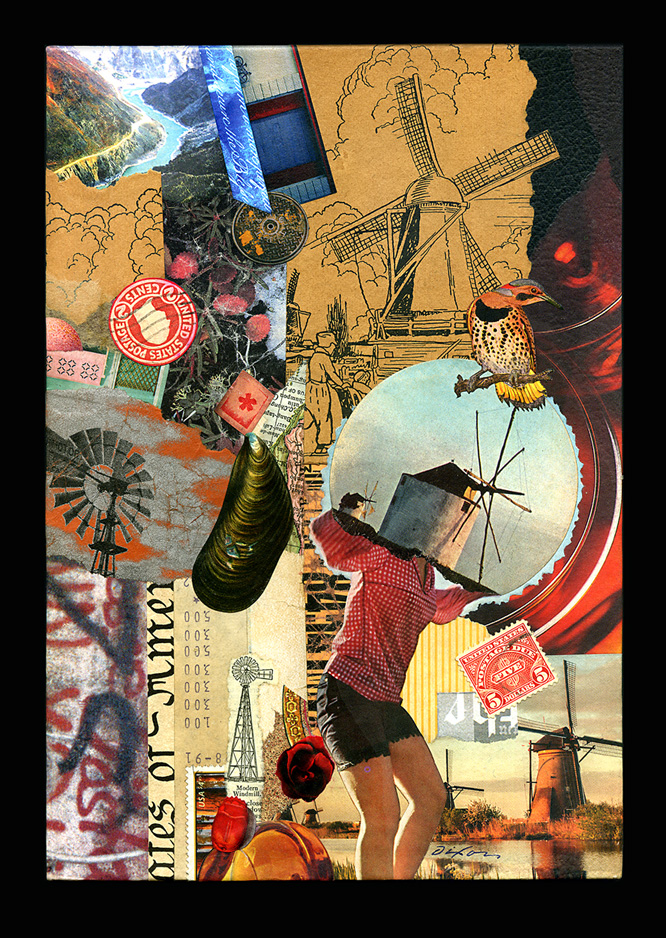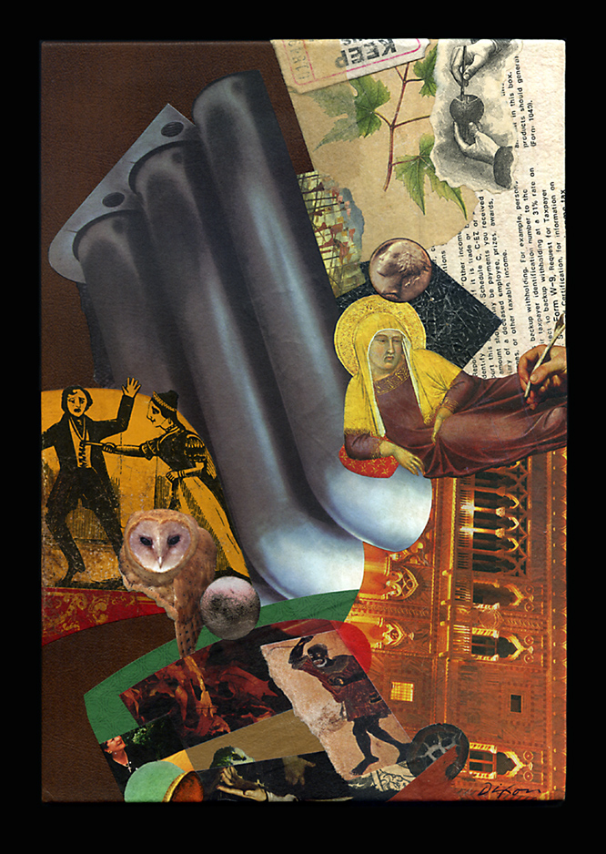 Curiosity is perhaps a common characteristic of all visual artists, but certainly it is a driving feature of what motivates the collage practitioner — curiosity about acquiring and editing discovered remnants, curiosity about choosing a substrate or background context, and curiosity about composing selected ingredients for creative juxtaposition. We are all, in essence, “curators” of what others have cast aside.