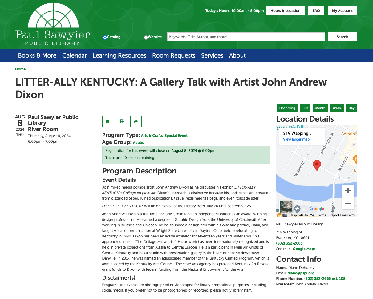 The resulting exhibition is at the downtown branch of Lexington Public Library. For as long as it lasts, please view the artworks online to see a strong body of landscapes completed on that hot day. Buy one!