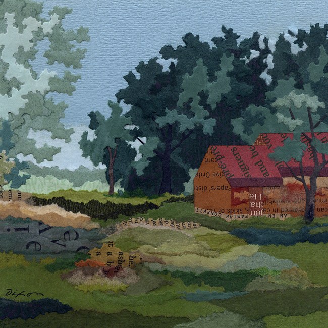 Tuesday, August 7th, 2018Adding a couple more items to my Roster of Shows: A collage miniature from 2014, Melting into Air, was displayed as part of “Little Pieces,” the fourth exhibition of the Nashville Collage Collective. It was an honor to be invited to participate with the dynamic group. Two of my plein-air collage pieces currently hang in the large grouping of works by members of PAACK. The Plein Air Artists of Central Kentucky meet regularly for organized “paint-outs” during the summer months, visiting local farms, parks, and historic landmarks. Locally, the exhibit is an annual favorite. The 2017 exhibit holds the distinction of being the show that yielded the most art sales last year in my hometown of Danville. If you haven’t checked out the summary from last year, read about how I solved the challenges of “painting” with small collage ingredients in the open air. I’ve been asked to make remarks during the upcoming “gallery talk” at the Community Arts Center, scheduled for the last Thursday of August. Perhaps I’ll see you there!