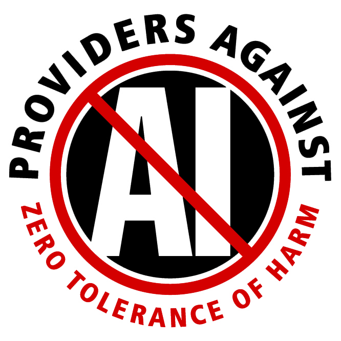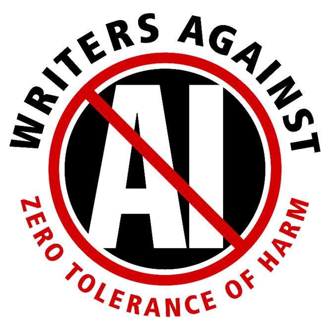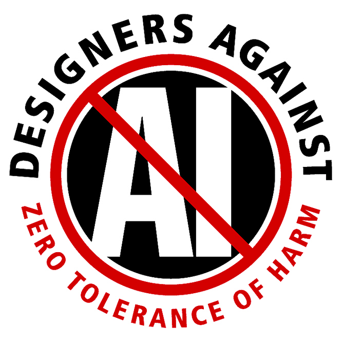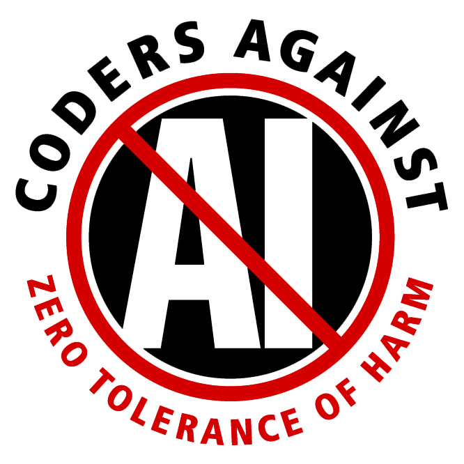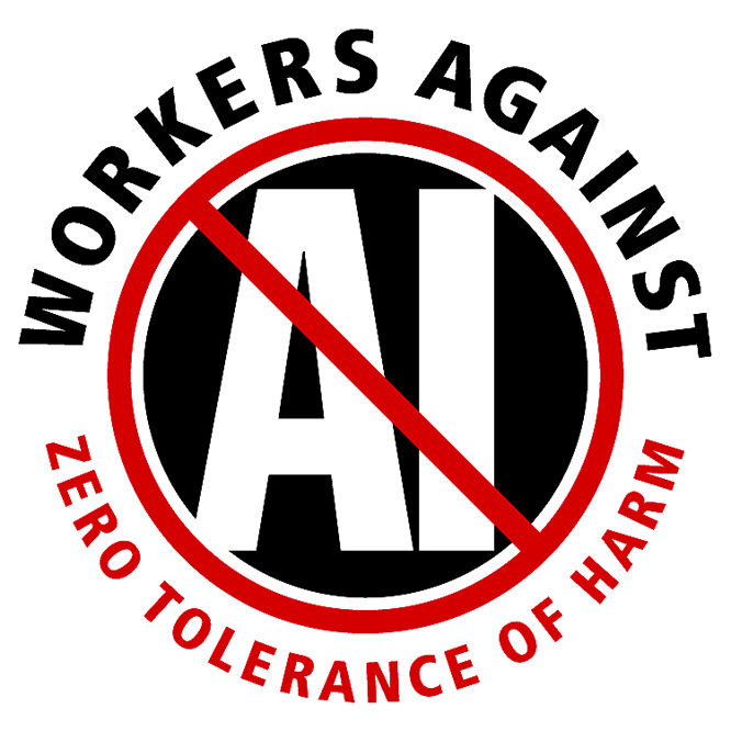 Runaway technology (with violation of rights, work-depriving automation, electromagnetic pollution, cognition-robbing language models, and legalized plagiarism) is no doubt with us for the duration, but I cannot for the life of me understand how people can rationalize the utility of so-called artificial intelligence, which surely will be out of proportion to the inevitable human cost. How can presumed utility be a justification for not being against it? Is it not unlike one being against environmental injury or war, even though many would justify their continuation and ignore the clear evidence of lasting damage? Nobody cried out for such an invasive tool that abuses the user. Nobody voted for it. The only way forward that is rational or righteous is “zero tolerance of harm.” Let’s see if those with a vested interest in seeding communities with AI can measure up to that standard. I won’t hold my breath. Meanwhile, from the margins, we pound against it. Share these emblems far and wide!