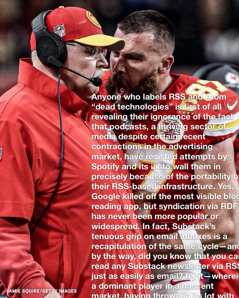 When the web promised that you could subscribe directly to the words and work of people you found interesting, then broke that promise for extractive purposes, email newsletters sprang up to fit the popular demand to Just See The Goddamn People You Follow In Chronological Order God Dammit. Email is not well fit for this purpose, any more than it is for supporting the rest of the internet. The things you want to savor from your favorite writers get buried among “the to-do list that grows without your consent” (credit to Sumana). But it kind of works. And things that kind of work are what we have, online, these days.