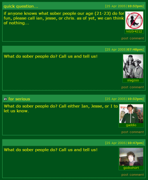Katie’s passed out on our futon in the front room; I put out a trash can and a bottle of water even though I don’t think she’ll need them. Her friends say she’s been like this since around 6 pm. It’s pretty clear none of them made an effort to stop her.